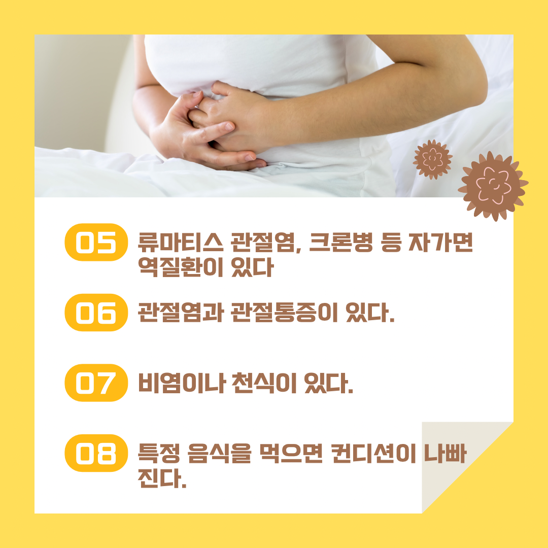 우선 위의 언급한 3가지를 잘 관리하기를 추천합니다. 밀가루 음식을 피하고 항생제를 남용하지 않으며 스트레스를 해소할 수 있는 방법을 찾아보시기 바랍니다. 좋은 음식을 먹고 운동을 하며 명상이나 취미 활동을 하고 질 좋은 수면을 취하면 더더욱 좋을 것입니다. 아울러 장내 유익균이 살기 좋은 환경을 만들기 위해 유산균도 섭취하고 식이섬유가 많은 채소도 챙겨 식사하세요.